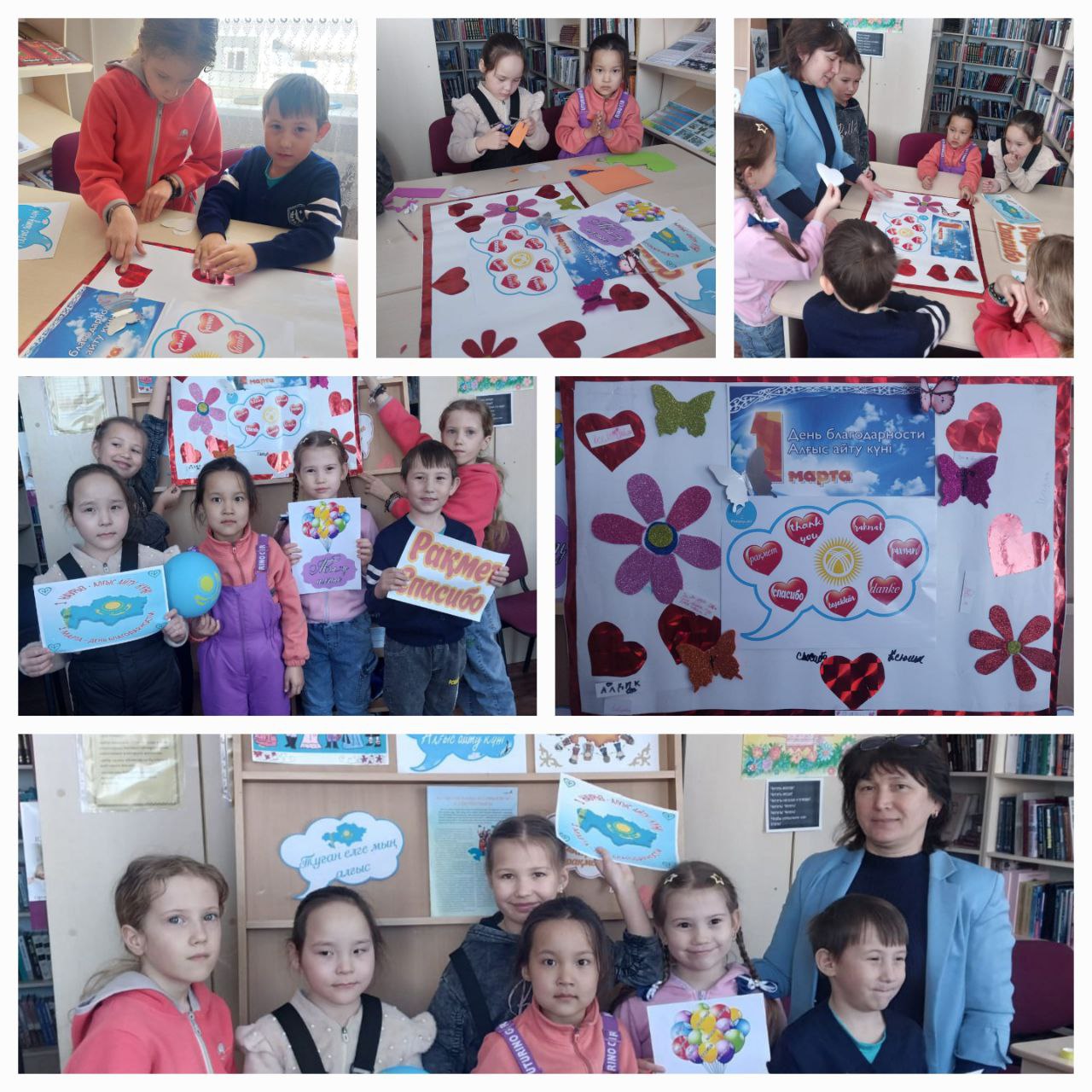 «Қағаз қиялы» үйірмесінің қатысушылары кітапханашының жетекшілігімен түрлі-түсті қағаз, ватман және формиран арқылы алғыс картасын безендірді. Балалар жүрекшелерге анасына, әкесіне, туыстарына, мұғаліміне және өзге де жақын жандарына арнаған алғыс сөздерін жазды.